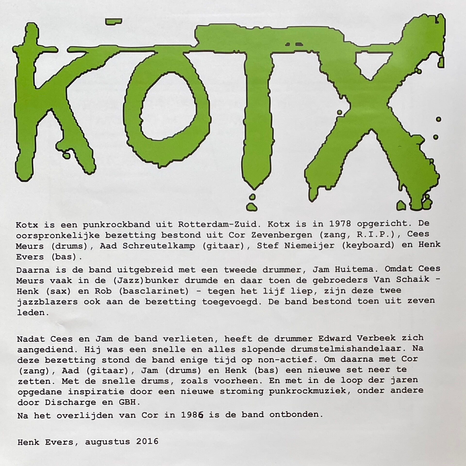 Kotx bestond tot 1986, na het overlijden van zanger Cor (Kotx) Zevenbergen werd het bijltje erbij neergegooid. De punk van Kotx uit de eerste jaren valt op door twee dingen: veel nummers bestaan uit twee akkoorden in plaats van de stereotype drie. En, iets wat ik helemaal vergeten was, het gebruik van een monofone synthesizer. Later, in de jaren ’80 voegden ook de gebroeders Henk en Rob van Schaik als jazzblazers iets verrassends toe, een soort scheepstoeterspunk die live geweldig werkte.