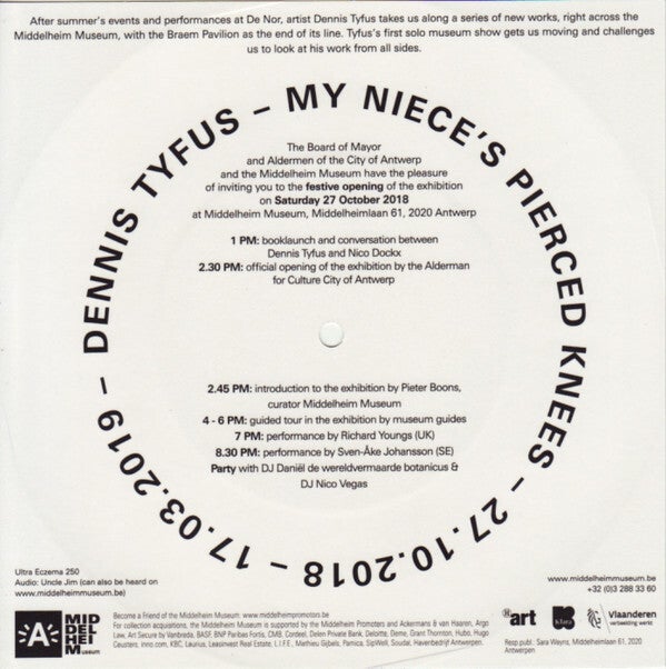 When visiting Antwerp last summer 2018, Uncle Jim (aka Alvarius B), recorded a rant for the invitation card single that anounces Dennis Tyfus' exhibition 'My Niece's Pierced Knees', opening on October 27th at Middelheim Museum in Antwerp. This card single was send out for free to everyone in the museum's mailing list.