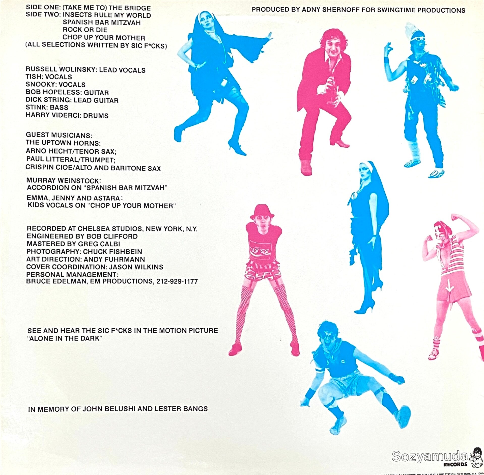 After building a worldwide reputation for unserious total-outrage rock, the uncommercially named but innocuous Sic F*cks — the brainchild of Bronx scenester Russell Wolinski and Trash & Vaudeville sisters Tish and Snooky — broke up, leaving New York nightlife in a bored panic. Fortunately, after a year of sporadic existence, the F*cks reformed and finally committed themselves — to vinyl — with a five-song 12-inch, produced by Andy Shernoff of the likeminded Dictators. The sound could be clearer, but for the delivery of such mind-bogglers as “Spanish Bar Mitzvah,” “Rock or Die” and “Chop Up Your Mother” (they’re only kidding), mere technical considerations hardly matter. Not as good as the band was live, but a fond reminder of a true mania.