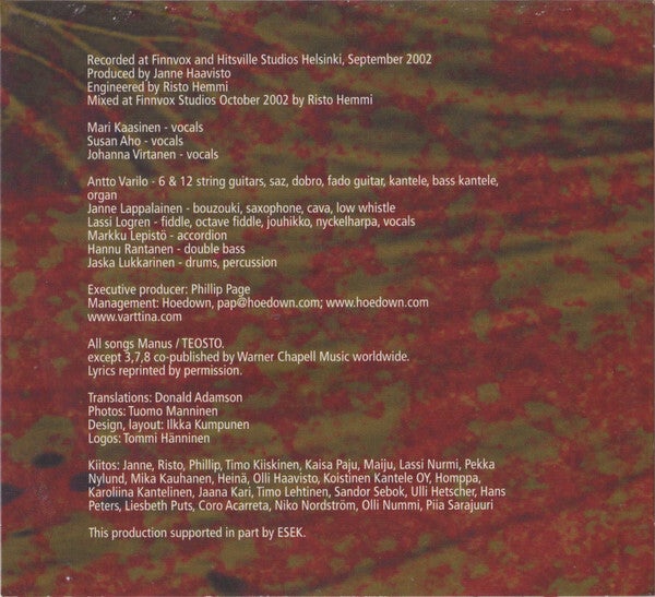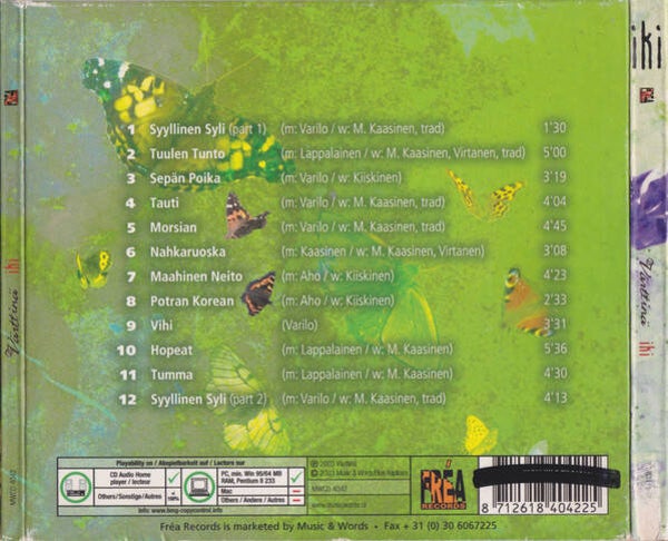 Twenty years after Värttinä began, there's still plenty of energy in the band, although they've come a long, long way. More mature, they've learned to use finesse over speed, and the themes they tackle here are certainly more adult -- romantic betrayal recurs in both "Syyllinen Syli" and "Nahkarouska," although in both instances the woman sends the faithless man packing. The keening voices, once a band trademark, have all but vanished, replaced by more delicate harmonies that suit the material, and the six instrumentalists give them plenty of room -- although they're quite capable of making a storm of noise, too. There's a real beauty to songs like "Tuulen Tunto" and "Maahinen Naito," while "Tauti" is edged with the black clouds of foreboding. After their live disc, they seem to be embarking on a new musical chapter, in search of new pastures, and the journey here proves very satisfying indeed. The frantic edge that characterized them for so long has vanished, although their joy in music-making very obviously remains.