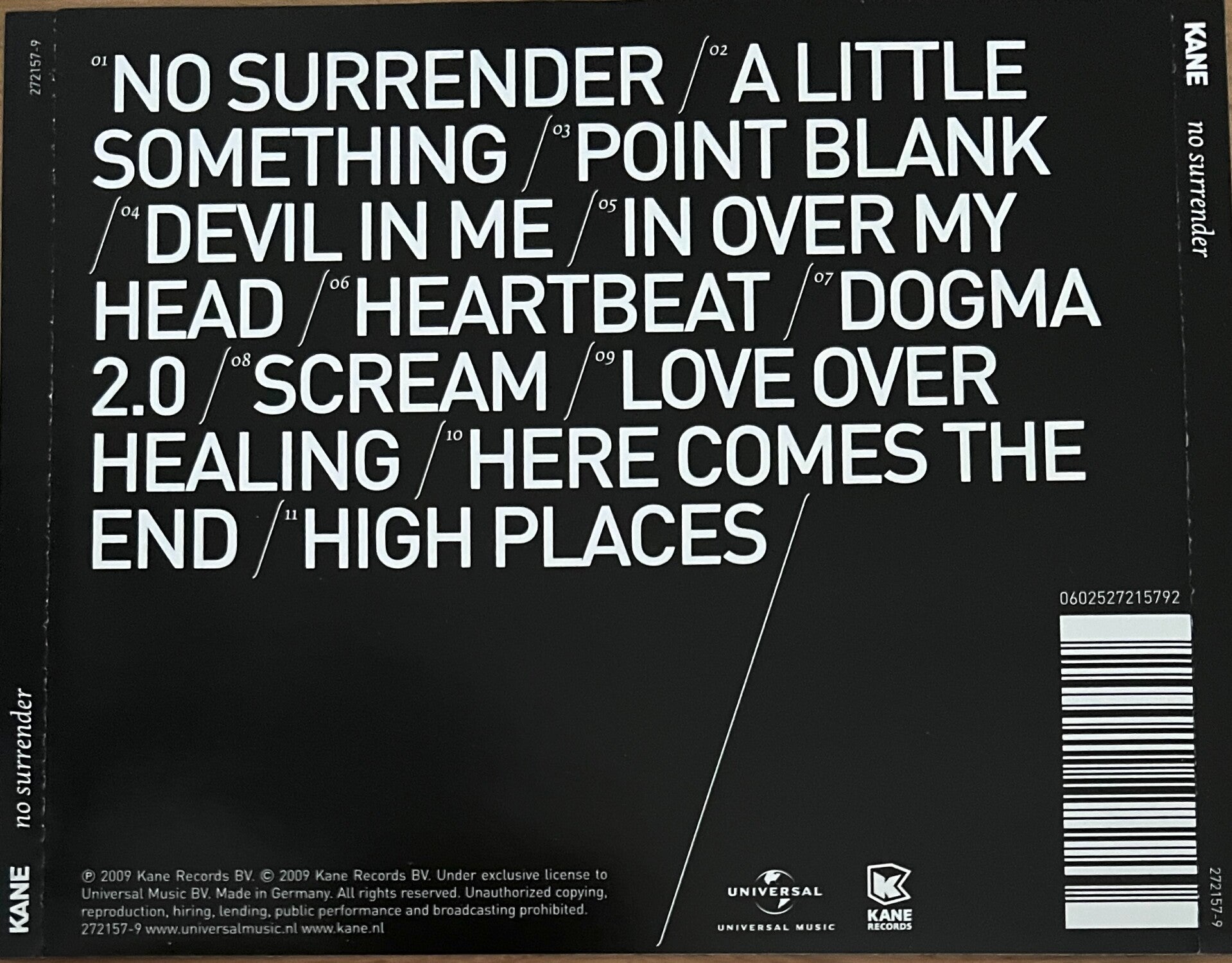 No Surrender is a studio album by Dutch rock band Kane, originally released in 2009. For the album, Kane went 'back to basics', going back to their own songwriting roots. For this fifth studio album, they wrote the songs in a short amount of time. Together with keyboardist Nico Brandsen, the album was fully produced by the band themselves. The album was warmly received by fans, and one of Kane's most successful periods began. The first single, "No Surrender", undeniably became Kane's biggest hit. Next to "No Surrender", the album brought forward the singles "Love Over Healing", "In Over My Head", "Scream" and "High Places".