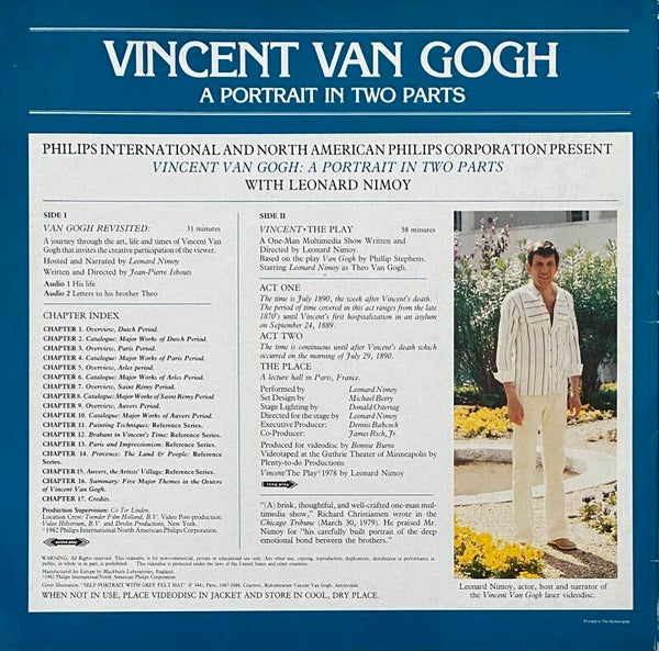 Side 2 contains in video the play Van Gogh from 1978, written by Philip Stephens with Leonard Nimoy as Theo van Gogh, Vincent's brother. It is a 58 minute one man multimedia show.