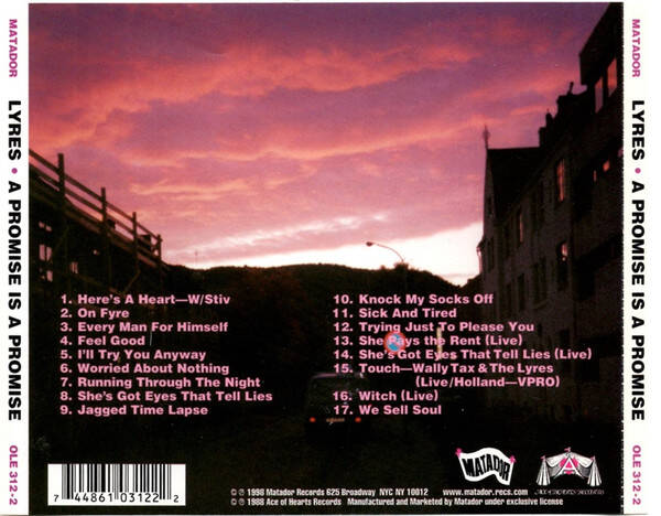 Also worth noting: Stiv Bators (the Dead Boys) guests on the opening track, "Here's a Heart." The original Ace of Hearts CD and cassette editions drop "We Sell Soul" (from Roky Erickson's pre-Thirteenth Floor Elevators group, the Spades) and add "Jezebel" (Frankie Laine), "Go-Go-Girl" (Bolan), "Help You Ann" (from On Fyre), "Don't Give It Up Now" (from Lyres Lyres), and "Cinderella" (the Sonics). "Help You Ann" and "Don't Give It Up Now" are the only live versions that don't quite work: the former sounds rushed -- maybe they were already tired of playing it by this point -- and the latter is marred by a homophobic comment (about AIDS) from lead singer/keyboard player, Jeff "Monoman" Conolly. Thankfully, he sticks to the original lyrics for most of the rest of the live material. A Promise Is a Promise isn't the best starting point for the Lyres neophyte, but, for those who already know and love On Fyre and Lyres Lyres, it's a worthy addition to their collection.