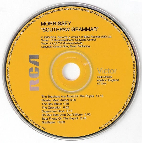 If Vauxhall and I represented a more mature Morrissey, Southpaw Grammar superficially presents a more rough and tumble version of the singer. As his previous single, "Boxers," indicated, Morrissey's fascination with boxing and violence has reached full fruition. The music appropriately reflects this, with growling, distorted guitars and martial rhythms. But Southpaw Grammar doesn't rock as hard or with as much style as the rockabilly-inflected Your Arsenal -- instead, it's his art rock album, complete with strings, drum solos, and two ten-minute songs. Of these, the winding, menacing "The Teachers Are Afraid of the Pupils" works the best, and it represents a significant change in Morrissey's outlook; instead of the children being outsiders, "the teachers" are.