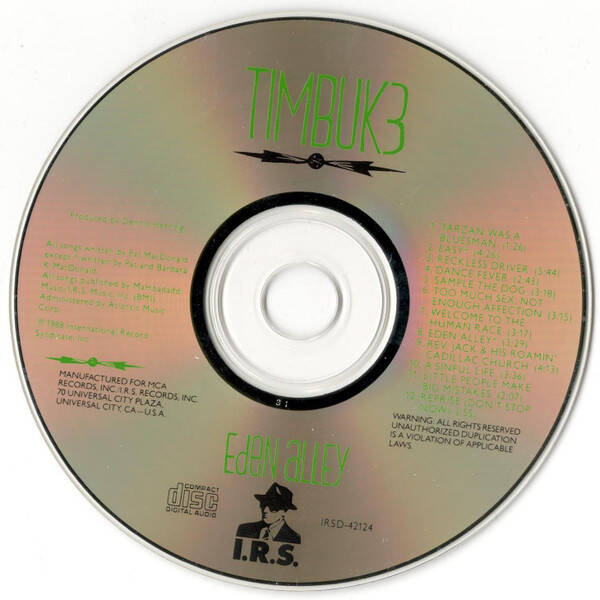 Critics bowed at the feet of Beck when, in the mid-'90s, he was able to successfully fuse elements of such disparate genres as funk, folk, and retro-rock. Few remembered that several years earlier, husband-and-wife duo Timbuk 3 had brought a similar (if more homespun) eclecticism to alternative rock with their programmed drums, willfully clunky rhythms, and lyrics clever enough to rival those of the best singer/songwriters. Eden Alley, the follow-up to 1986's Greetings From Timbuk 3, didn't result in a Top 40 hit the way its predecessor had -- there's nothing as outright funny here as "The Future's So Bright, I Gotta Wear Shades" -- but it contained the same brand of irony-fueled lyrics and smart songcraft as the band's debut.