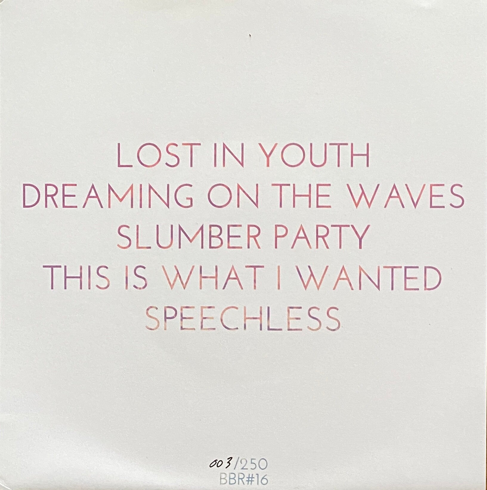 Contains stenciled/stamped 5 track 7" in a double sided sleeve, double sided insert & stamped envelope containing BBR Letter, BBR History part III, Personalised confetti, pack of 5 iron-on patches & 6 track download (extra track is 'Cry & Lie').