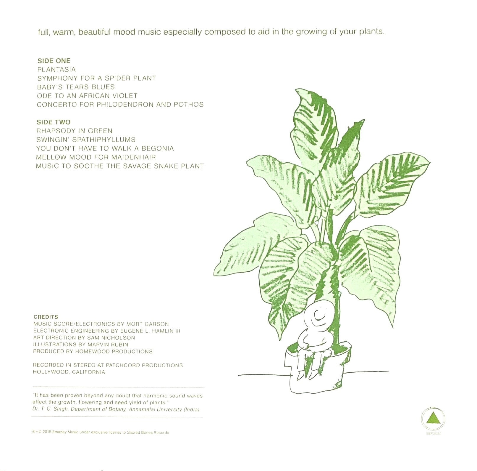 At times, Mother Earth's Plantasia is wonderfully kitschy: The bubbly "You Don't Have to Walk a Begonia," is one of several moments where Garson's past as a lounge music composer comes to the fore. Yet even the songs that could be too on-the-nose are remarkably inventive. "Baby's Tears Blues" manages to be sultry and whimsical at the same time, sprinkling its swaying rhythm with what sounds like stardust; befitting its name, "Music to Soothe the Savage Snake Plant" gives a slightly spooky cast to the album's calming vibe. The album's more forward-thinking moments are among its most striking: "Ode to an African Violet"'s slinky rhythm and gravity-defying synths make it a standout along with "Rhapsody in Green," where rippling tones suggest unfurling leaves, dewdrops, and gentle breezes so meditatively that it borders on proto-New Age music. Meanwhile, "Swingin' Spathiphyllums" is a gorgeous piece of cosmic pop that seems to call future travelers like Stereolab and Optiganally Yours into being. While some of Garson's other albums may have been more overtly groundbreaking, there's something endearing and pure about Mother Earth's Plantasia that resonates even more powerfully decades later. Its cult-favorite status in the late 2010s led Sacred Bones to reissue it in 2019 (the label's founder, Caleb Braaten, first stumbled upon it in 2002 while working in a Denver record store), reminding listeners old and new of Garson's legacy as a groundbreaking electronic artist.