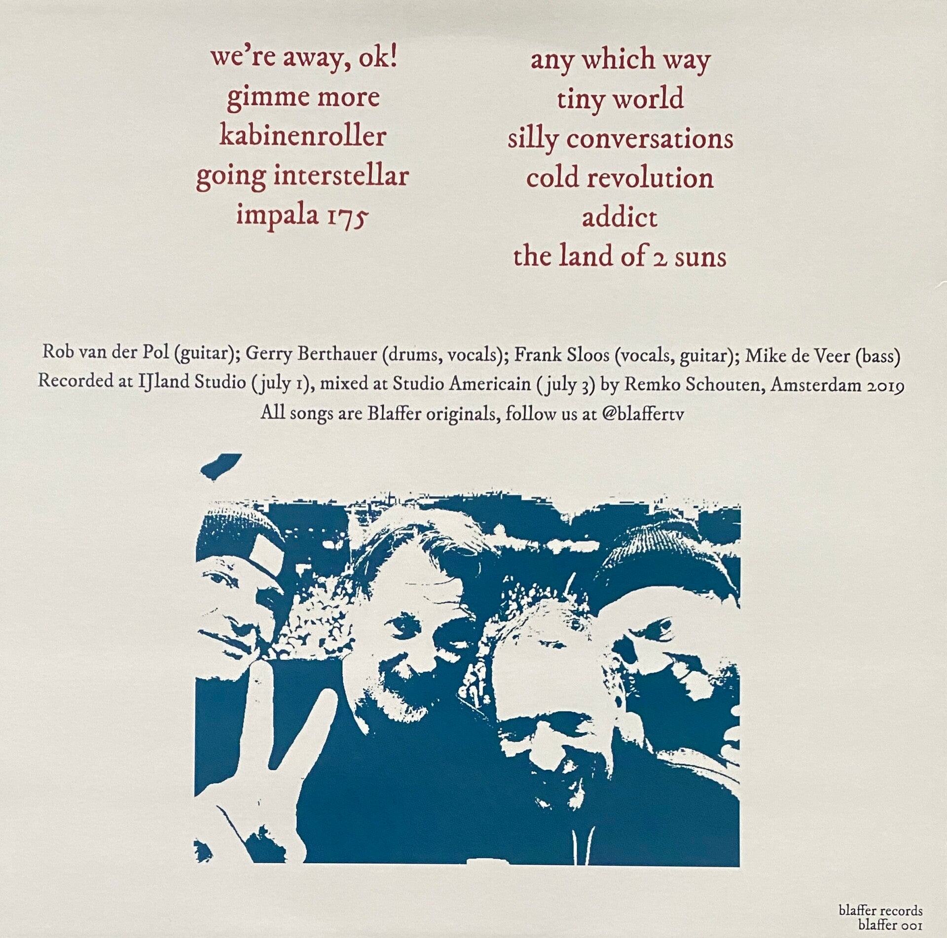 Puntige songs met harde gitaren, een kop en een staart en een minimum aan solo’s en gefreak. De veteranen van het Amsterdamse Blaffer hebben hun sporen reeds lang geleden verdiend in bands als Outrageous, Loveslug, Treble Spankers en SCA, dus met de street credibility zit het wel snor. Gelukkig is het geen bak eendimensionale herrie maar zijn Blaffers songs rijk aan uitermate prettige melodieuze gitaarpartijen (We’re Away, OK!) en haast gezellige Oi!-achtige meezing refreintjes (Gimme More, Going Interstellar). Voor jonge en oude punks en de dingen die voorbij gaan.